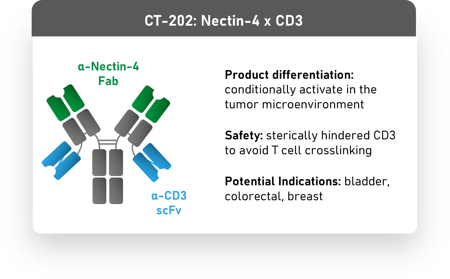 CT-202 is a bispecific antibody engineered in an IgG format, featuring two Nectin-4 binding arms and two CD3-binding single-chain Fv domains, along with a silenced Fc region designed to be functionally monovalent. This structure helps prevent unwanted T-cell activation and improves safety. While Nectin-4 is present in healthy skin, sweat glands, and hair follicles, making targeted therapies prone to dermatological side effects, CT-202 employs pH-dependent binding to both Nectin-4 and CD3, minimizing interaction with healthy tissues and optimizing selectivity for tumor cells within the tumor microenvironment.